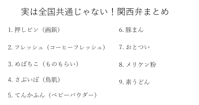 全国共通語だと思っていたら、実は関西弁だったという方言をまとめていきました。