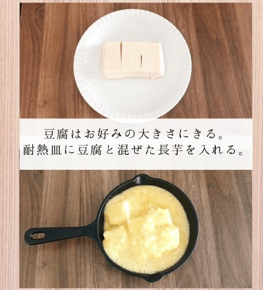 4. 耐熱皿(今回はスキレット)に豆腐と混ぜた長芋を入れる