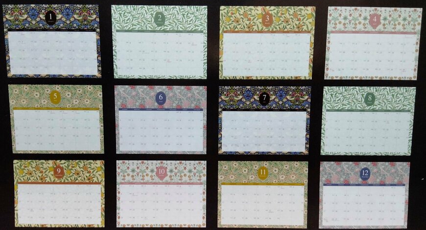 モリスのカレンダーの12か月のデザインは画像のようになっています。12か月すべてが違うデザインではなく、6つのデザインが繰り返し利用されています。