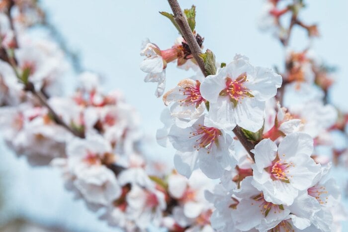 桜に似た花を咲かせる落葉低木樹、ユスラウメ。花色には白や薄ピンク、濃いピンクがあり、いずれも甘い香りが楽しめます。