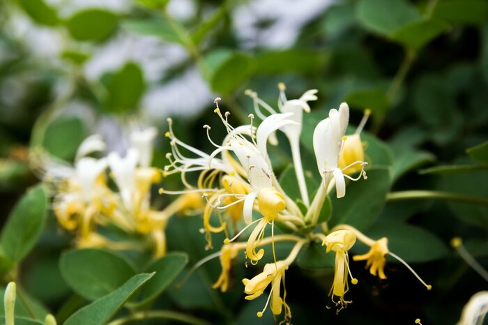 白からイエローに花色が変わる。お洒落でユニークな「スイカズラ」など