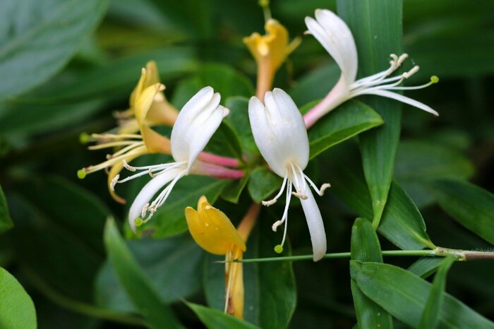 咲き始めは白、花が終わるにつれて徐々に黄色に変わる不思議な花を咲かせるスイカズラ。春から初夏にかけて開花する半落葉性つる性低木で、別名・金銀花とも呼ばれています。
