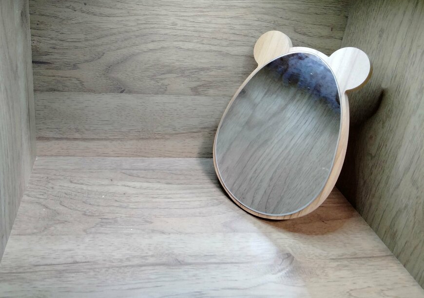 こちらがダイソーのクマ型のスタンドミラーです。クマの形が大変愛らしいです。木製の太めの枠が、ナチュラルさと高級感を出しています。