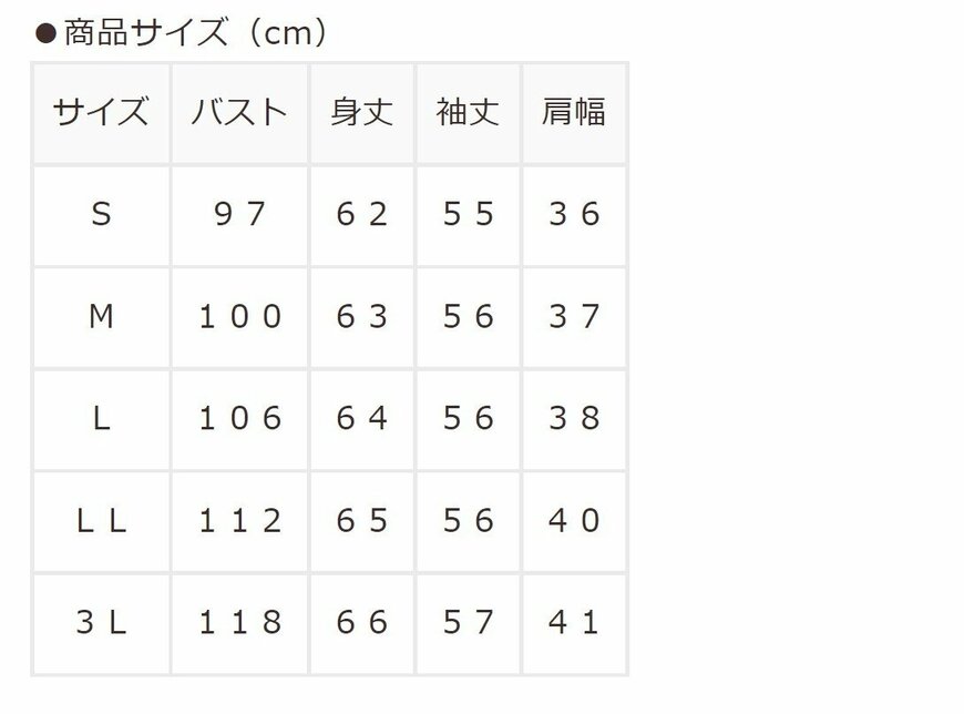 - サイズ:S、M、L、LL、3L(3LはWEB限定)