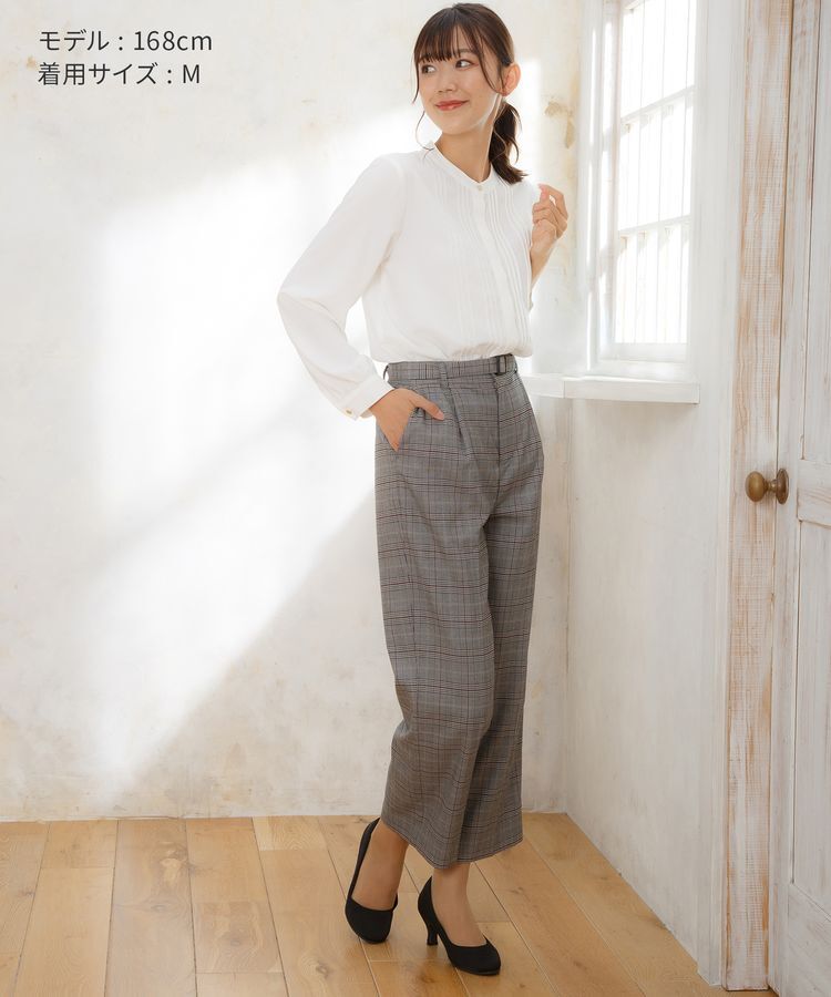 ハニーズのピンタックブラウスは、フェミニンな雰囲気があるものの、洗練されたシンプルなデザインとなっています。したがって、パンツスタイルとの相性も抜群です。