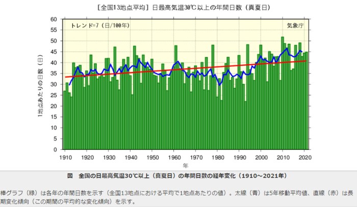 真夏日の平均年間日数は、統計開始から30年間(1910~1939年)では約35日でしたが、直近30年間(1992~2021年)では約41日と、おおむね80年ほどで1.2倍となっています。