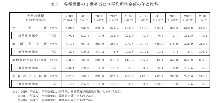 全世帯で見た平均所得は約552万円ですが、高齢者世帯は約312万円と200万円以上下回ります。