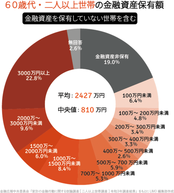 円グラフを見てわかる通り、最も多いのは「3000万円以上」で22.8%、次に「金融資産非保有」で19.0%が多くを占めています。