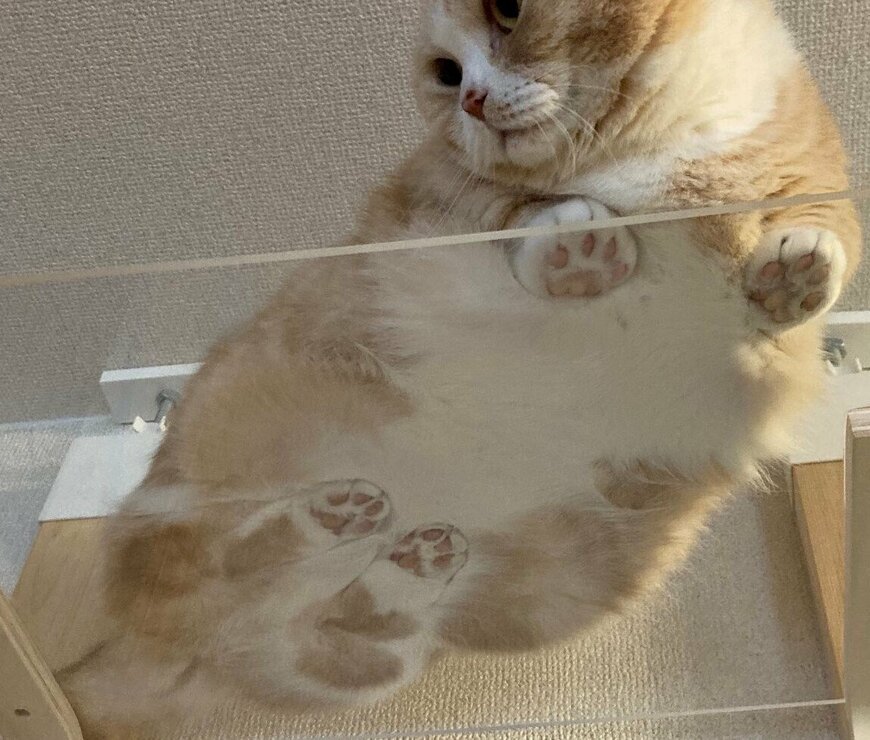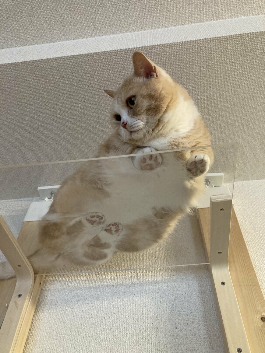 透明な板のような場所で、1匹の猫ちゃんがくつろいでいます。