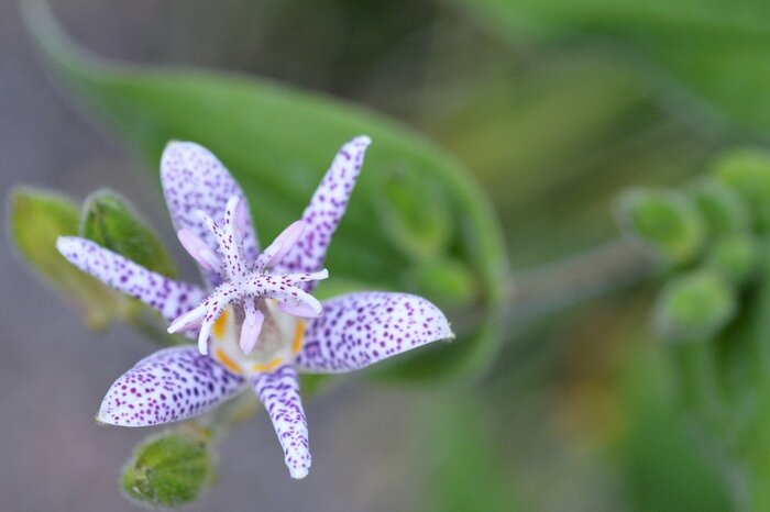 唯一無二のオシャレな花を咲かせるホトトギス。晩夏から秋にかけて開花する多年草で、直径2~3センチほどの花を上向きに咲かせます。