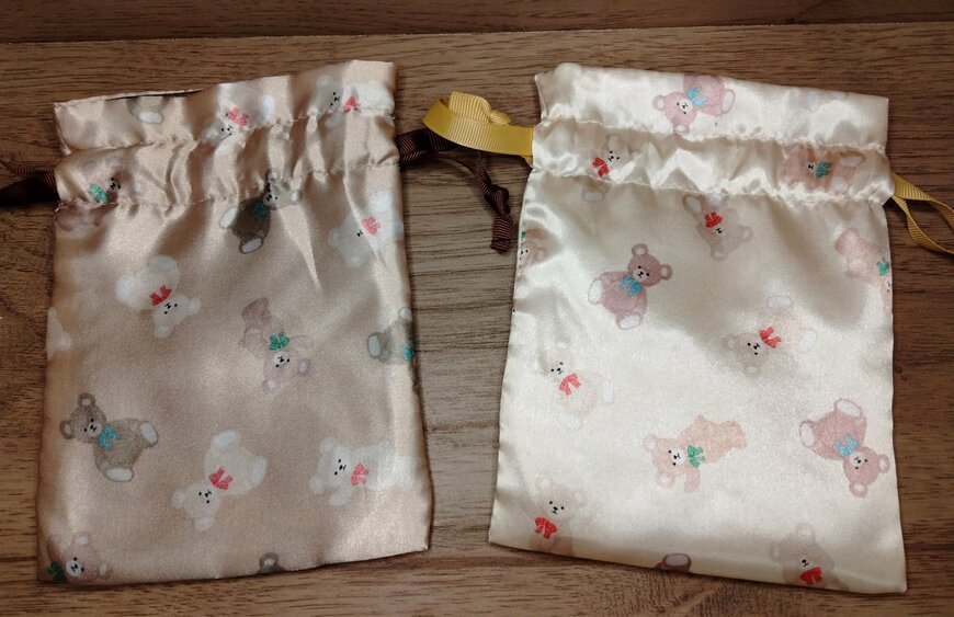 セリアのテディベア柄の巾着は、サテン生地で高級感があるだけでなく、デザインも素敵です。