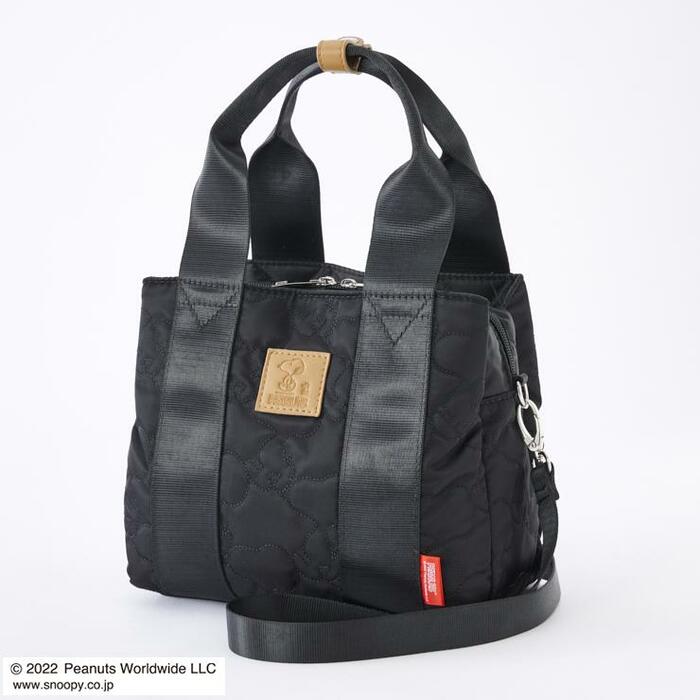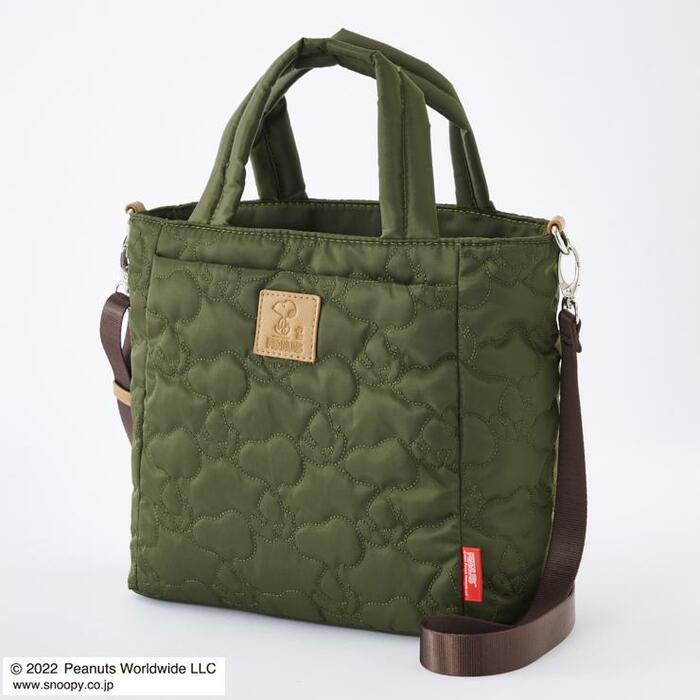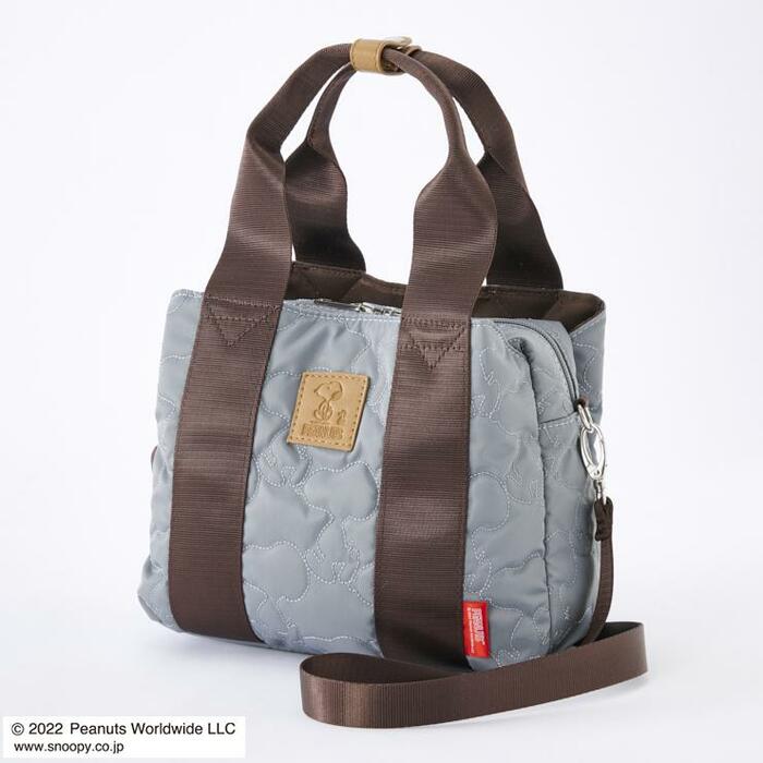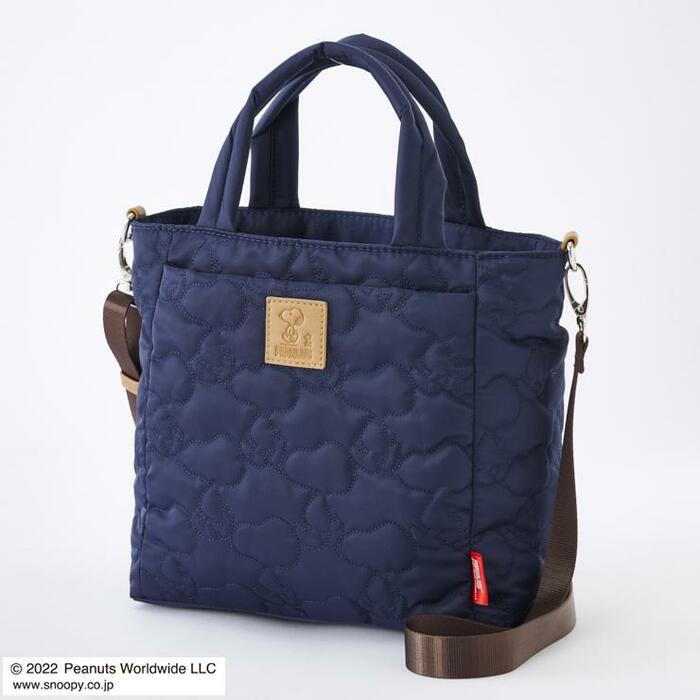 ナイロン生地にスヌーピーのキルト加工をした手提げバッグです。外側の前後にアオリポケットがついているのも嬉しいポイント。持ち手を固定しショルダーバッグとして持も使える便利な2WAY仕様で、ちょっとしたお出かけに最適なアイテムです。