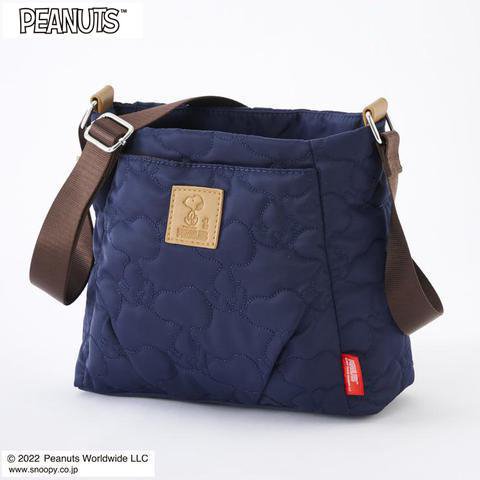 ナイロン生地にスヌーピーのキルト加工をしたショルダーバッグです。外側には前ポケット、内装にはアオリポケットが付いているので収納力も抜群。