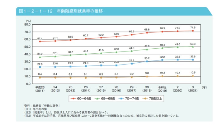 まずは内閣府「令和4年版高齢社会白書」より、2011~2021年の働く60~70歳代の推移を確認しましょう。