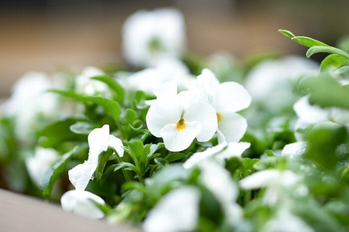 パンジーのホワイトカラーは、純白、中心部だけピンクや黄色になる品種、花びらの縁だけ紫に染まる品種などバリエーションがとても豊か。花ガラを小まめに摘むと、次から次に新しい花を咲かせてくれます。※参考価格:100円前後(3号ポット苗)