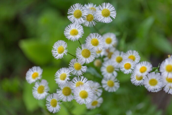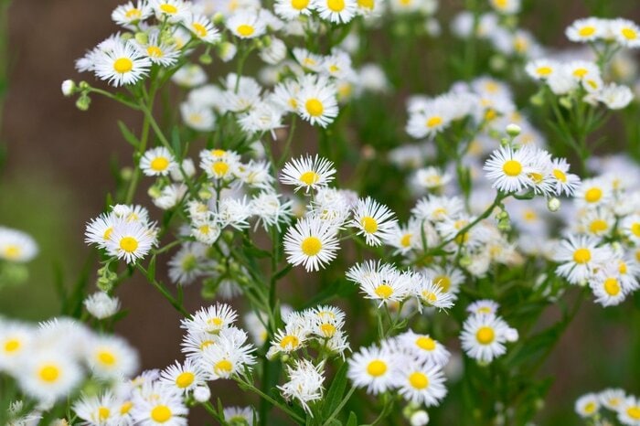 マーガレットに似た小さな花を咲かせるエリゲロン。春から秋にかけて開花する多年草で、源平小菊という名前でも親しまれています。