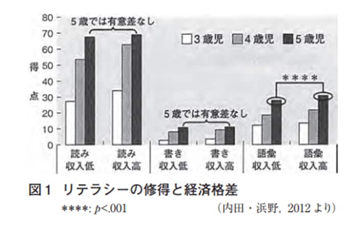 2018年に「江戸川大学こどもコミュニケーション研究紀要」で発表された「学力格差は幼児期から始まるか?~保育と子育ては子どもの貧困を超える鍵になる~」では、日本だけではなく、韓国、中国、ベトナム、モンゴルそれぞれの大都市圏に住んでいる3歳から5歳の幼児3000名と親や保護者を対象にした短期縦断調査結果(お茶の水女子大学・梨花女子大学・華東師範大学・ベネッセ次世代育成研究所の共同研究として実施された調査)を踏まえ、読み書き能力と語彙力は所得によって違いが生じるのか考察しています。