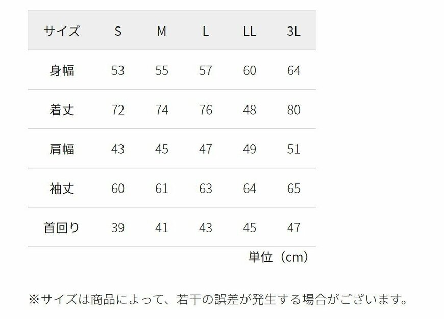 カラーとサイズが豊富なのは、嬉しいポイントといえるでしょう。サイズごとの大きさは下図の通りです。