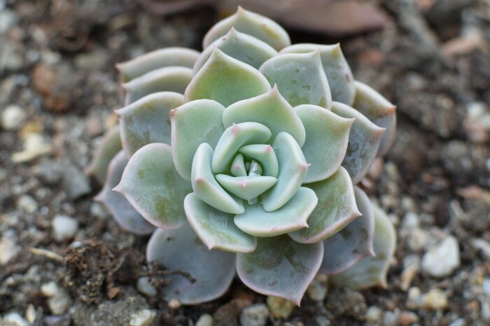 不朽の名作「白牡丹」。整った顔立ちで、白っぽくて花のようにふっくらしています。夏の暑さがやや苦手ですが、秋にはツンと尖った葉先がピンクに紅葉し、色っぽく蘇りますよ。参考価格:250~350円(2.5号鉢)
