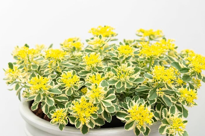 セダム・アトランティスは、マーブル模様の斑入りの葉が個性的で、明るいイエローの花もポップです。参考価格:1000円前後(3号ポット苗)