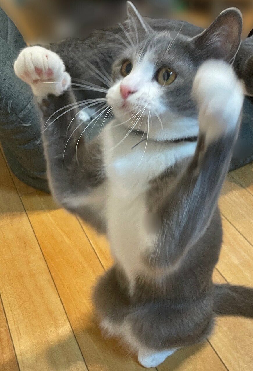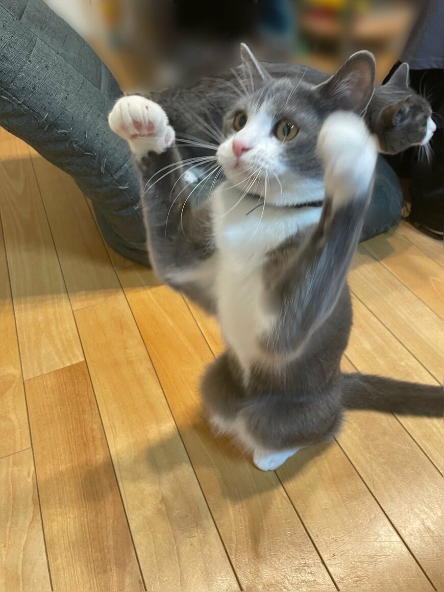 見事に足を揃えて座りながら、猫じゃらしを捕まえようと頑張る姿がなんとも愛らしいですね。