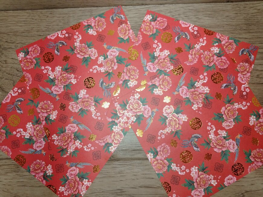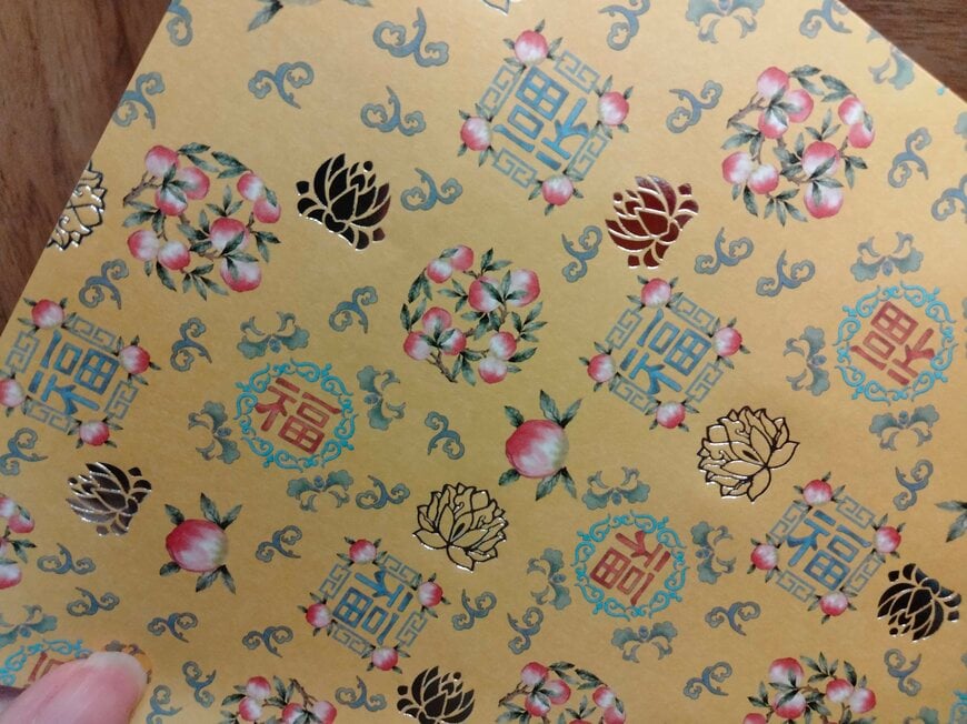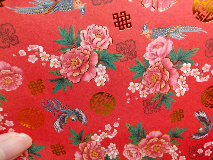 まずは、鳳凰や牡丹が描かれた赤色のペーパーです。中華らしいテイストが魅力的です。チャイナドレスの生地にありそうな、豪華仕様となっています。