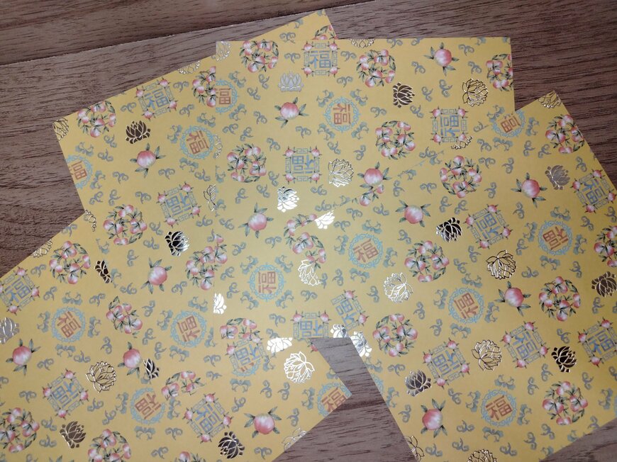 最後に、中華飯店風のデザインの黄色のペーパーです。倒福マークや桃など、飯店らしいモチーフがたっぷりと描かれています。
