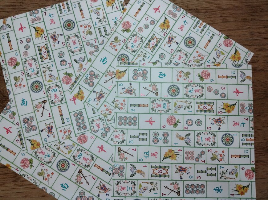 次は、中国麻雀牌が描かれた白色のペーパーです。麻雀牌には、唐子や鳳凰といった中華モチーフが描かれていて、愛らしくも個性的です。