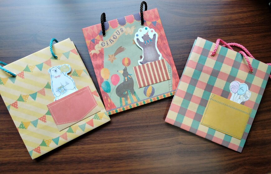紙袋のデザインは、動物たちがサーカスをしているようなデザインで愛らしいです。物語性を感じることができ、絵本の挿絵を切り抜いたようです。