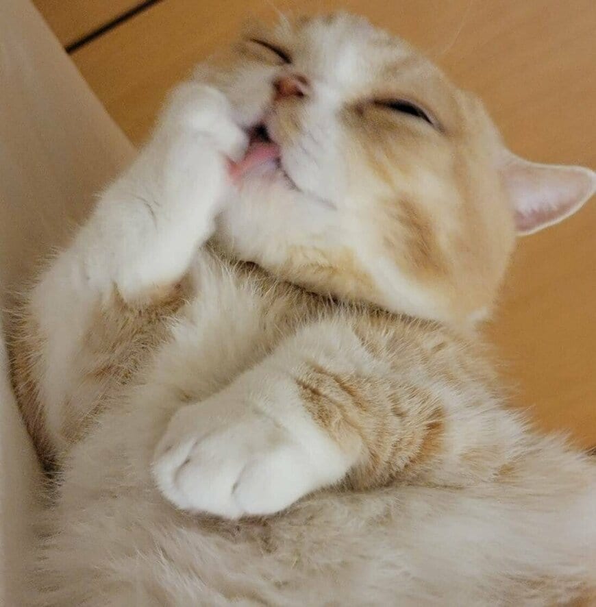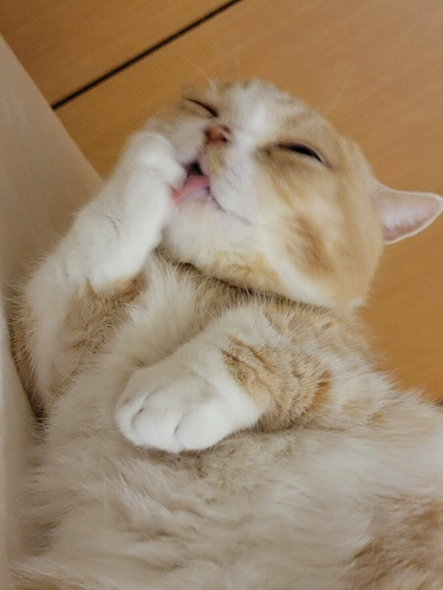 1匹の猫ちゃんが、リラックスしながら毛づくろいをしています。