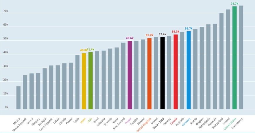 経済協力開発機構(OECD)が公表する「平均賃金 (Average wage)」データを見てみると、2021年の平均賃金トップはルクセンブルクの7万5305ドル。