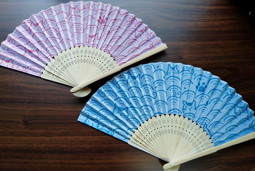 こちらが猫青海波柄の扇子です。画像の通り、ピンクとブルーがあります。伝統模様の青海波ですが、猫が加わることで、ポップでモダンな雰囲気が出ています。