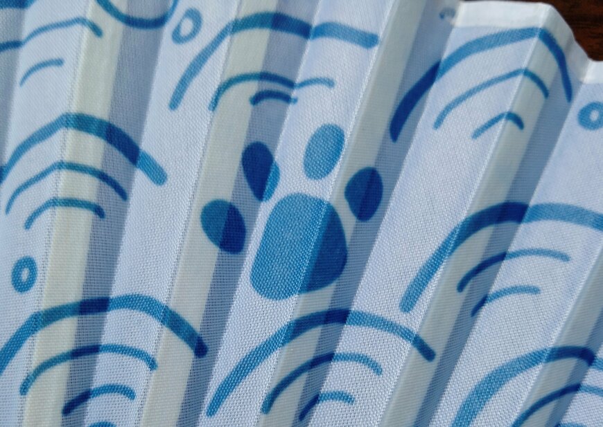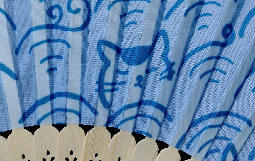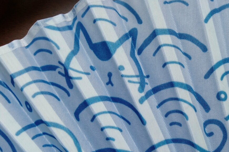 遠目から見ると、伝統的な青海波模様の扇子に見えます。しかし、近づいて見ると、青海波に猫が混ざっているのが分かるというデザインです。