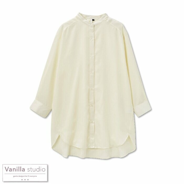 バニラスタジオの定番のシャツワンピースです。お尻まですっぽり隠れて、後ろ身頃にタックが入っているのでゆったり着られます。ニットと重ね着したり、前を開けて羽織りとして着たりスタイリング豊富なアイテムです。