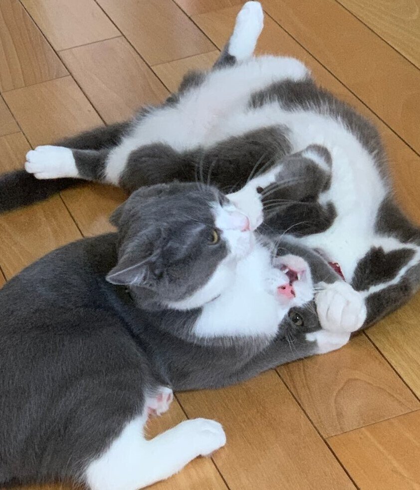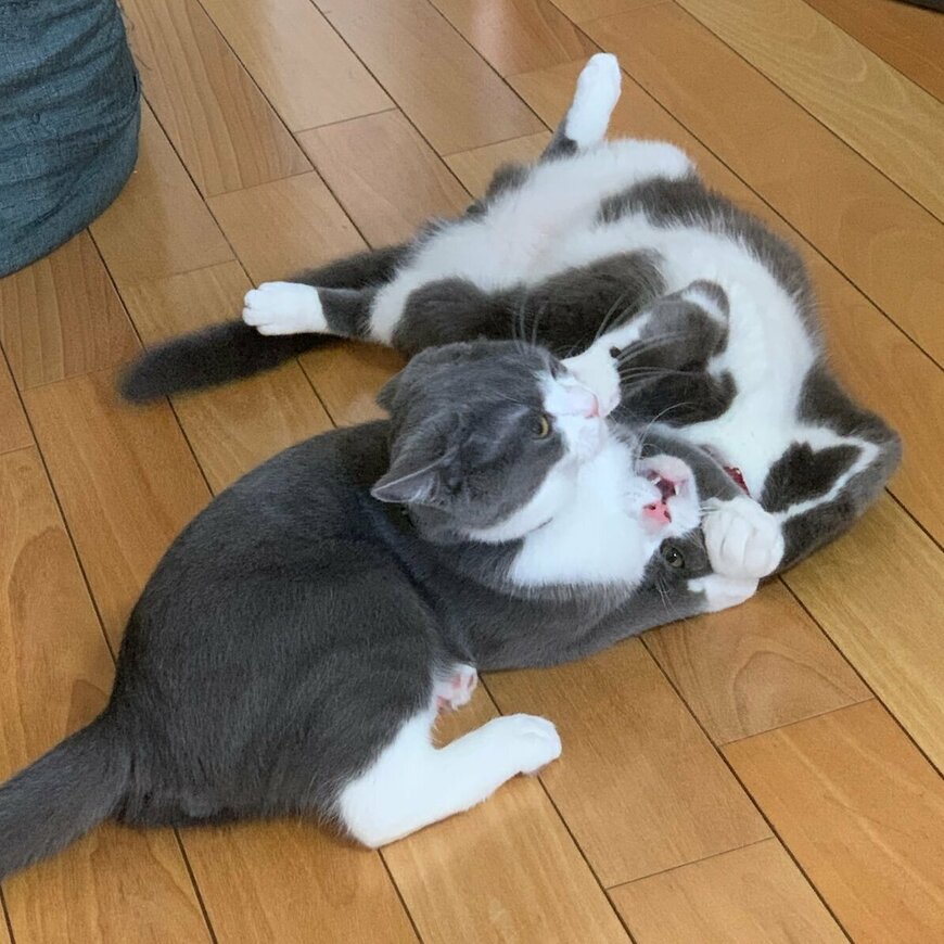 いつもこうして仲よく遊んでいるのでしょうか。猫たちの日常を切り取った1枚に、笑みがこぼれてしまいますね。