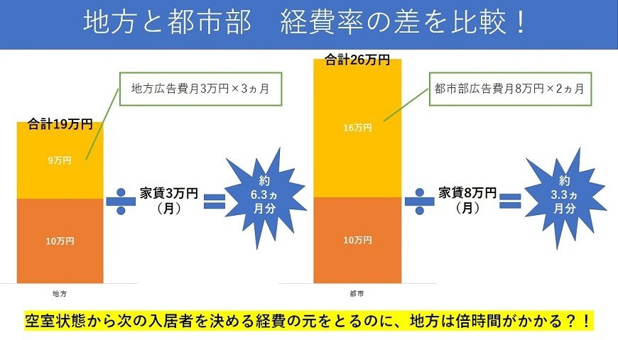 地方では家賃が安いにも関わらず、都市部とほぼ同じ額の修繕費がかかります。さらに一度空室となると都市部より次の入居者が決まりづらく、新規入居者の広告費も多くなる傾向にあります。