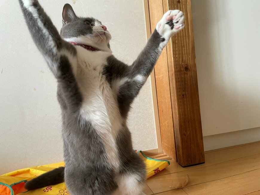 そこに写っていたのは、両足でバランスをとりながら両手を広げる猫ちゃん。