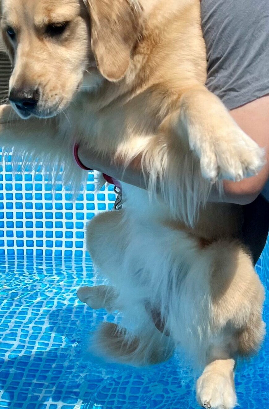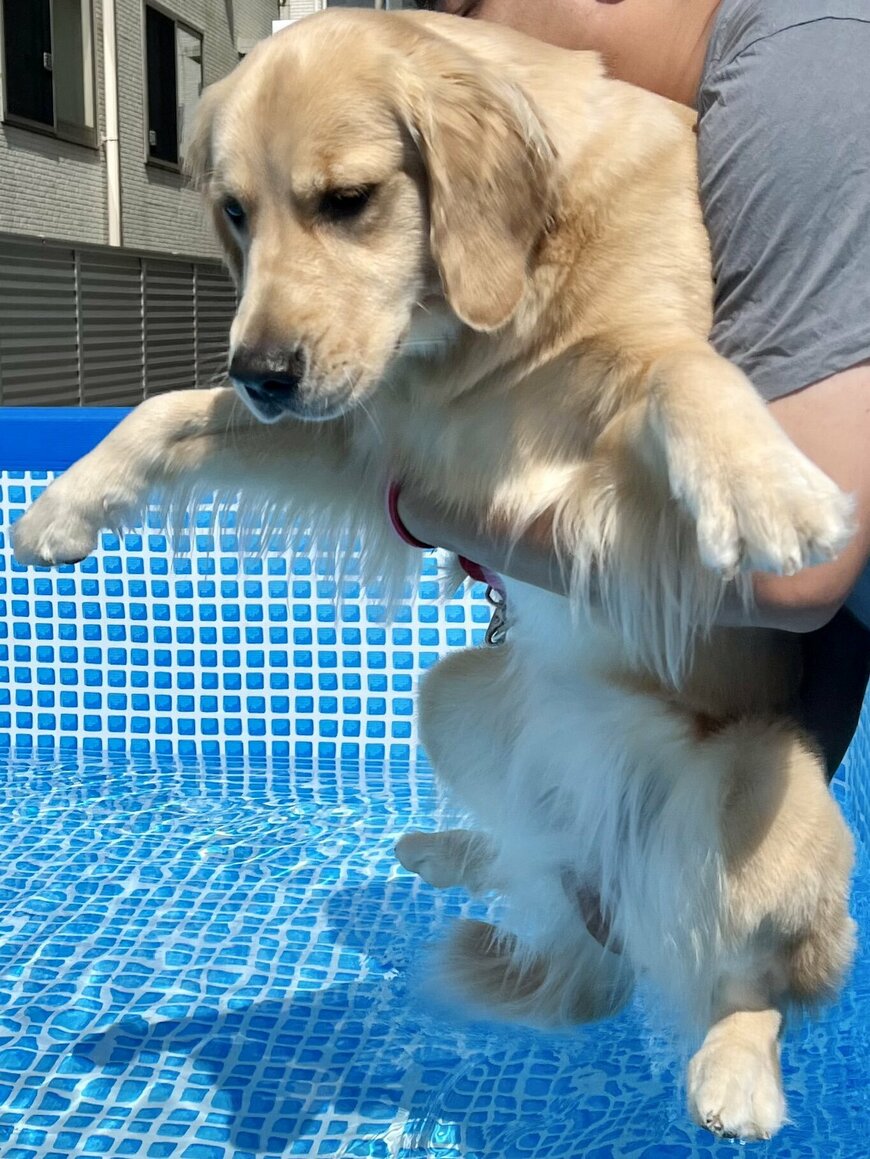 プールに入る瞬間~泳ぐ気満々に開いている犬の左手がクリームパンみたいでかわいい🐾←マニアックw pic.twitter.com/Xp7oL9lA88