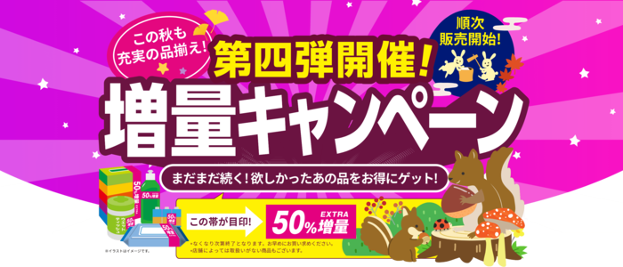 マスク、ティッシュなどの除菌系から、お菓子、サプリメントなどの食品など、お値段そのままに中身が増量した商品が9月より順次発売されます。なかには、50%増量の商品もあり、お得感いっぱいです。