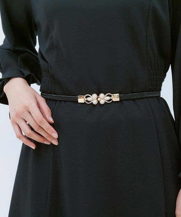 「パール付ゴムベルト」はその名の通り、ウエストサイズの調整のいらないゴムベルト。フックを引っ掛けるだけなので着け外しが簡単です。コーデのワンポイントとして活用しやすい控えめなバックルサイズで、応用しやすいベルトですよ。