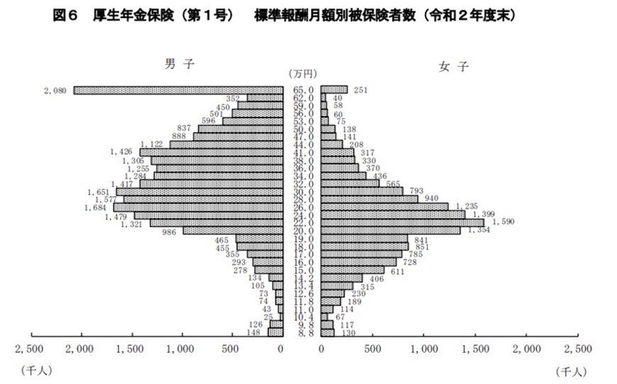 ただ、厚生労働省「令和2年度 厚生年金保険・国民年金事業年報」の標準報酬月額別被保険者数の分布を見る限り、男子では上限の第 32 級(65 万円)が 208 万人と最も多くなっている一方、女子は第 15 級(22 万円)が 159 万人と最も多くなっており、まだ完全に同水準とは言えません。