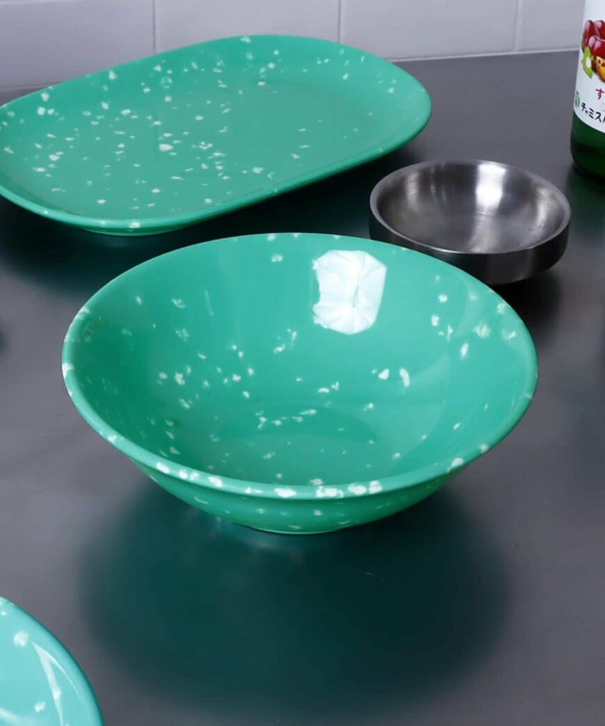 韓国ドラマや映画の定番アイテムであるメラミンの深皿です。価格は330円(税込)で、画像のグリーンの他にベージュもあります。