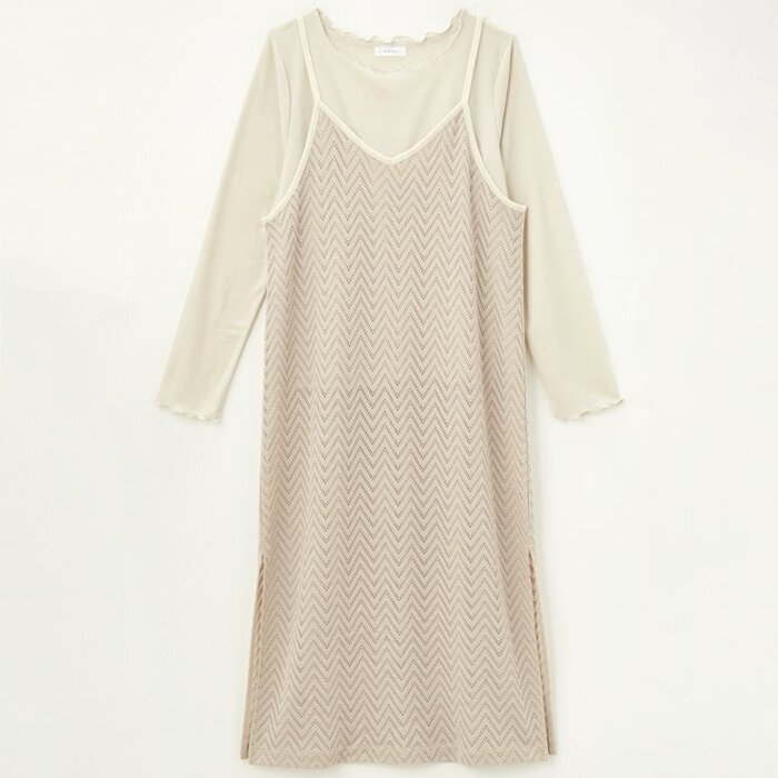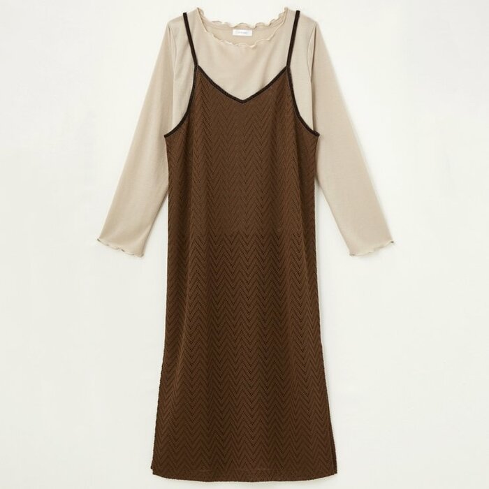 ファッションインフルエンサー、yumiさんコラボのセットアイテムです。透け感と立体感のあるジャカード素材のキャミワンピとセミシアーのカットソープルオーバーの2点がセットになって登場。ダークブラウンとベージュ、2色を展開しています。