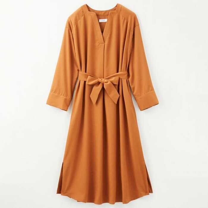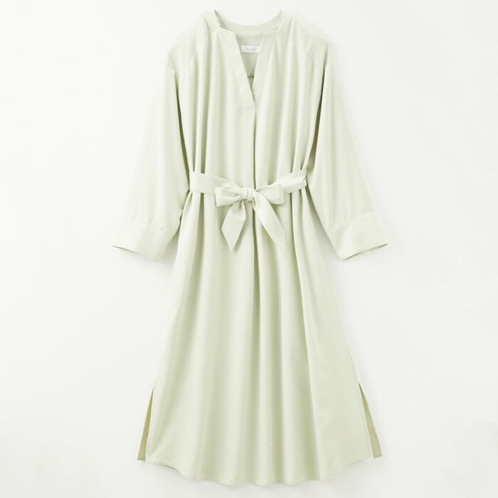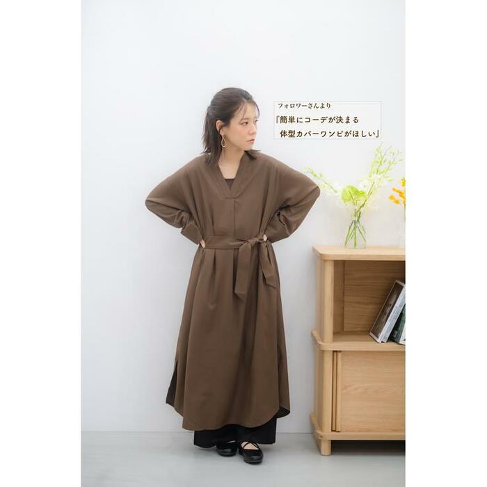 ファッションインフルエンサー、yumiさんコラボのワンピースです。シンプルなVネックのロングワンピースは、インナーにデザインカットソーを合わせると今年らしいコーディネートが楽しめます。付属のベルトを使ってウエストマークもできるなど、アレンジを楽しめる一着です。