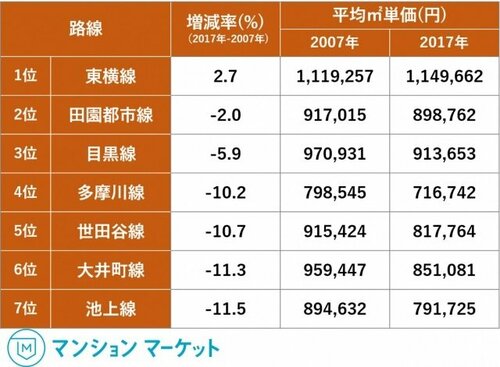 最も資産性が高いのは「東横線」 7路線のうち唯一、築10年で㎡単価が2.7%上昇!