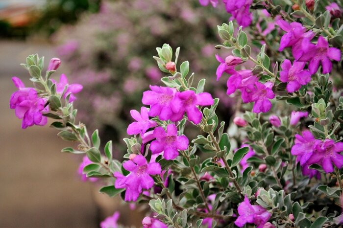 赤紫の花とシルバーリーフの対比が美しいレウコフィルム。1年に2回、春と秋に開花する樹高30~200センチの常緑低木樹です。