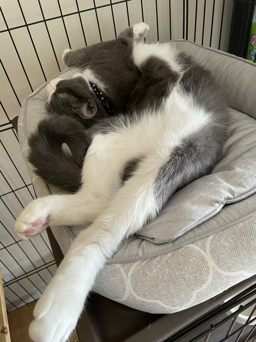 面白くも可愛らしい「寝相のクセが強い猫ちゃん」に、思わず癒される光景でした。