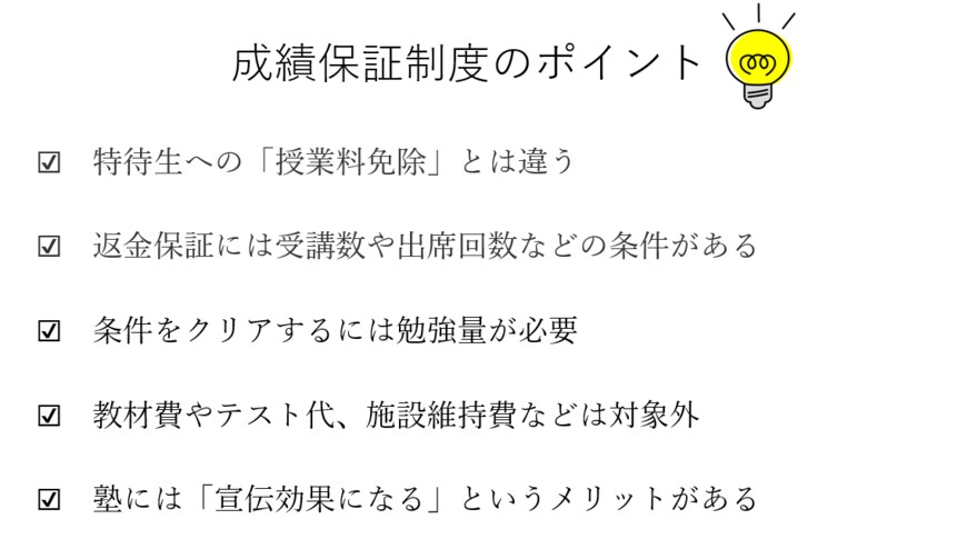 「一定の期間内に特定の科目が二十点以上アップしなければ授業料無料保証」などと謳っているケースが多く、授業料返金よりは「規定期間内に目標達成できなければ塾が指定する期間の授業料を無料にする」というのが主流です。