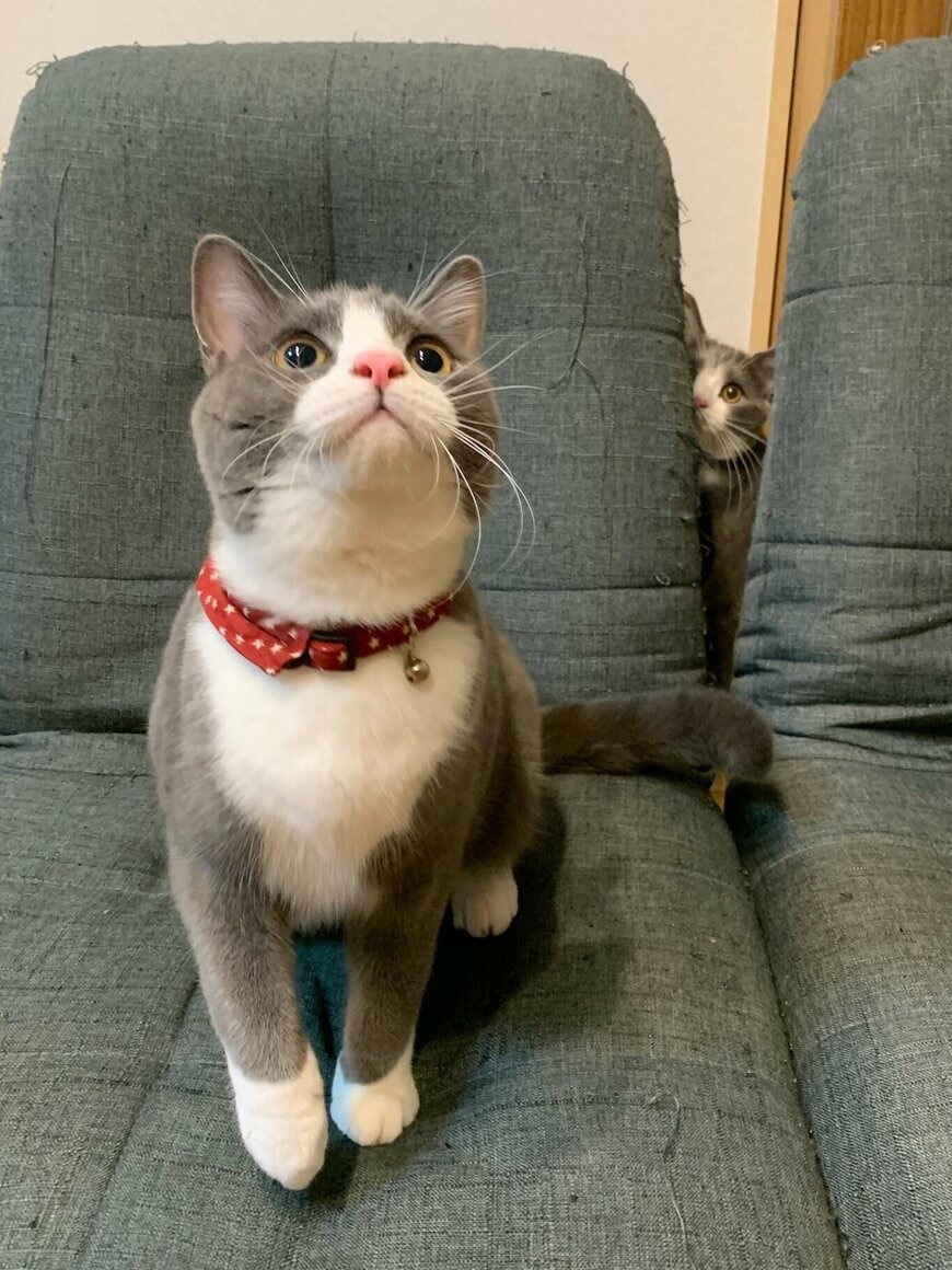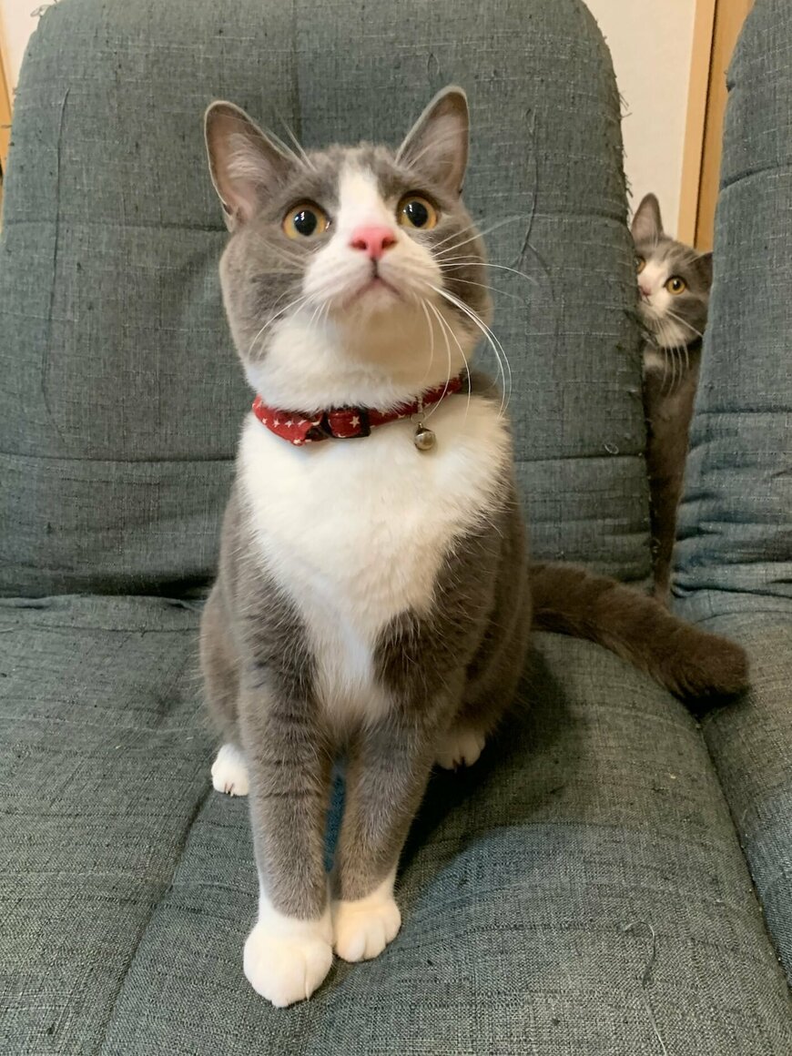 背もたれの隙間から、もう一匹の猫ちゃんが覗いていました。
