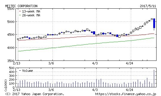 2017年5月11日の前場終了後、技術者派遣大手のメイテック(9744)が2017年3月期決算を発表しました。午前中の株価は52週高値である5,110円近辺で推移していましたが、決算発表後の後場の株価は一転して急落となり、終値は前日比約▲7%安で引けています。また、翌日の12日も続落となり2日間で最大約▲15%の下落となっています。